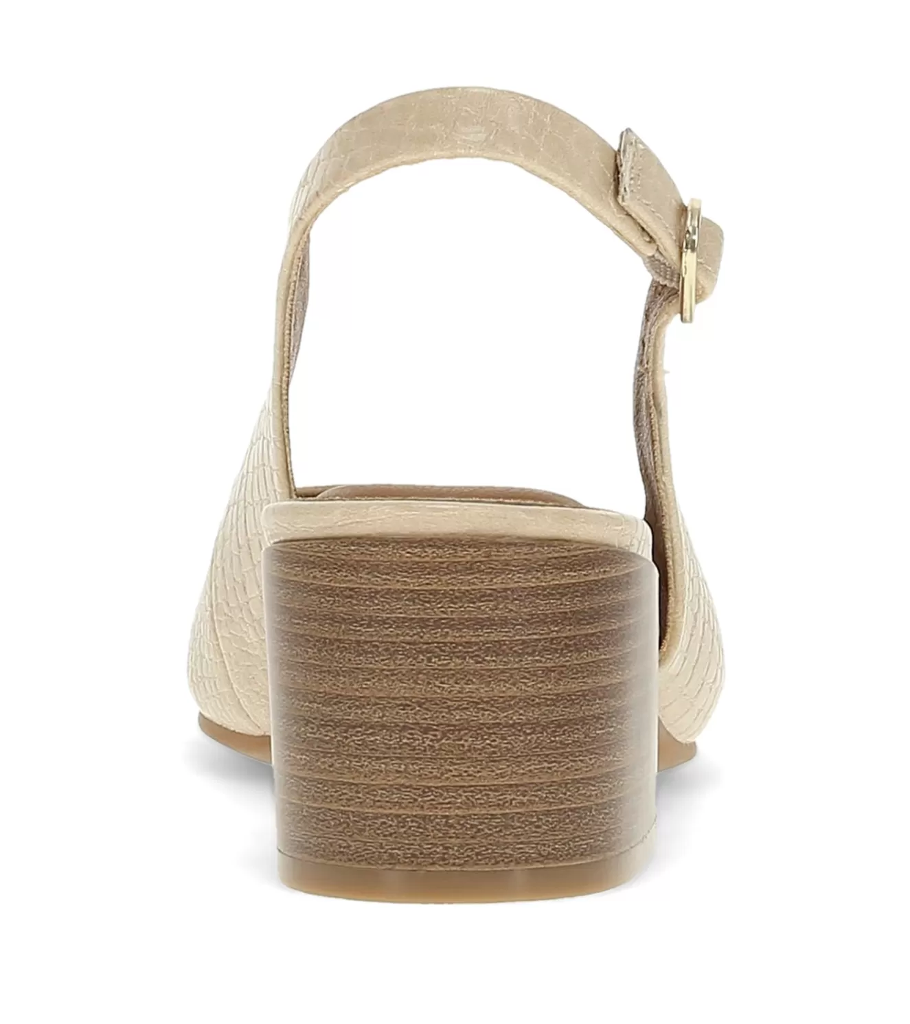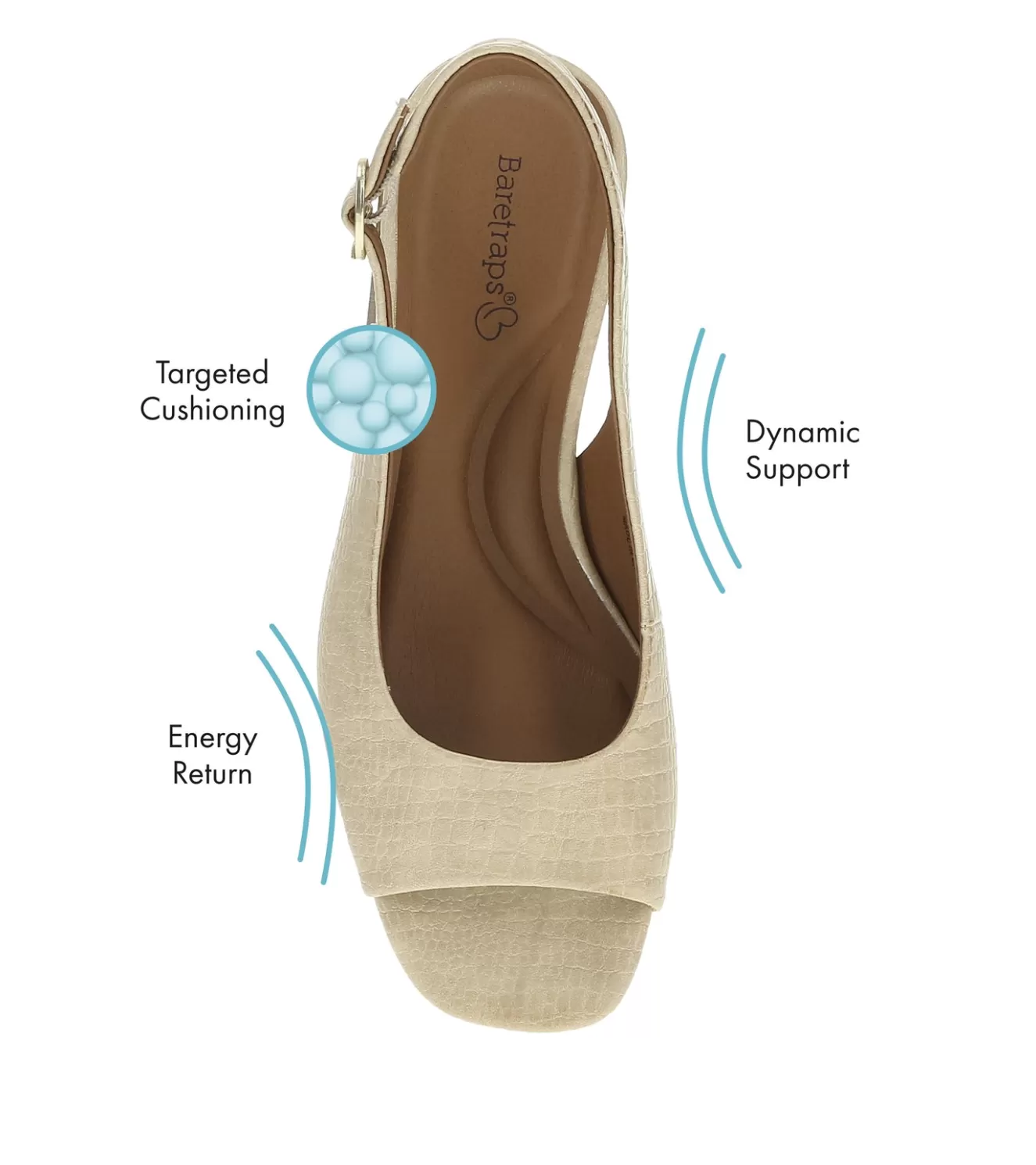 Exude comfort and style with the Baretraps Promise Slingback Pump. Crafted with a sleek synthetic upper, this versatile pump offers an adjustable buckle closure for a personalized fit that adapts to your foot. The real magic lies in the Bubble Tech technology – strategically placed cushioning with tiny air bubbles that compress and expand, providing energy-returning support with every step.As you move, the dynamic support contours and adapts to the natural curve of your foot, cradling you in cloud-like comfort. The open-toe design and block heel add a touch of modern elegance, while the lightweight, flexible outsole ensures effortless movement throughout your day.Whether you’re dressing up for the office or a night out, the Baretraps Promise Slingback Pump will elevate your look without compromising on comfort. Experience the perfect balance of fashion and function, and step into the promise of all-day ease. Treat your feet to the best with this must-have addition to your shoe collection.