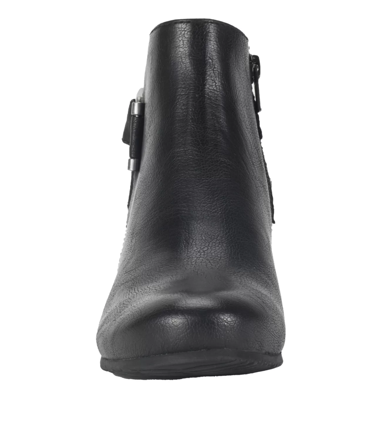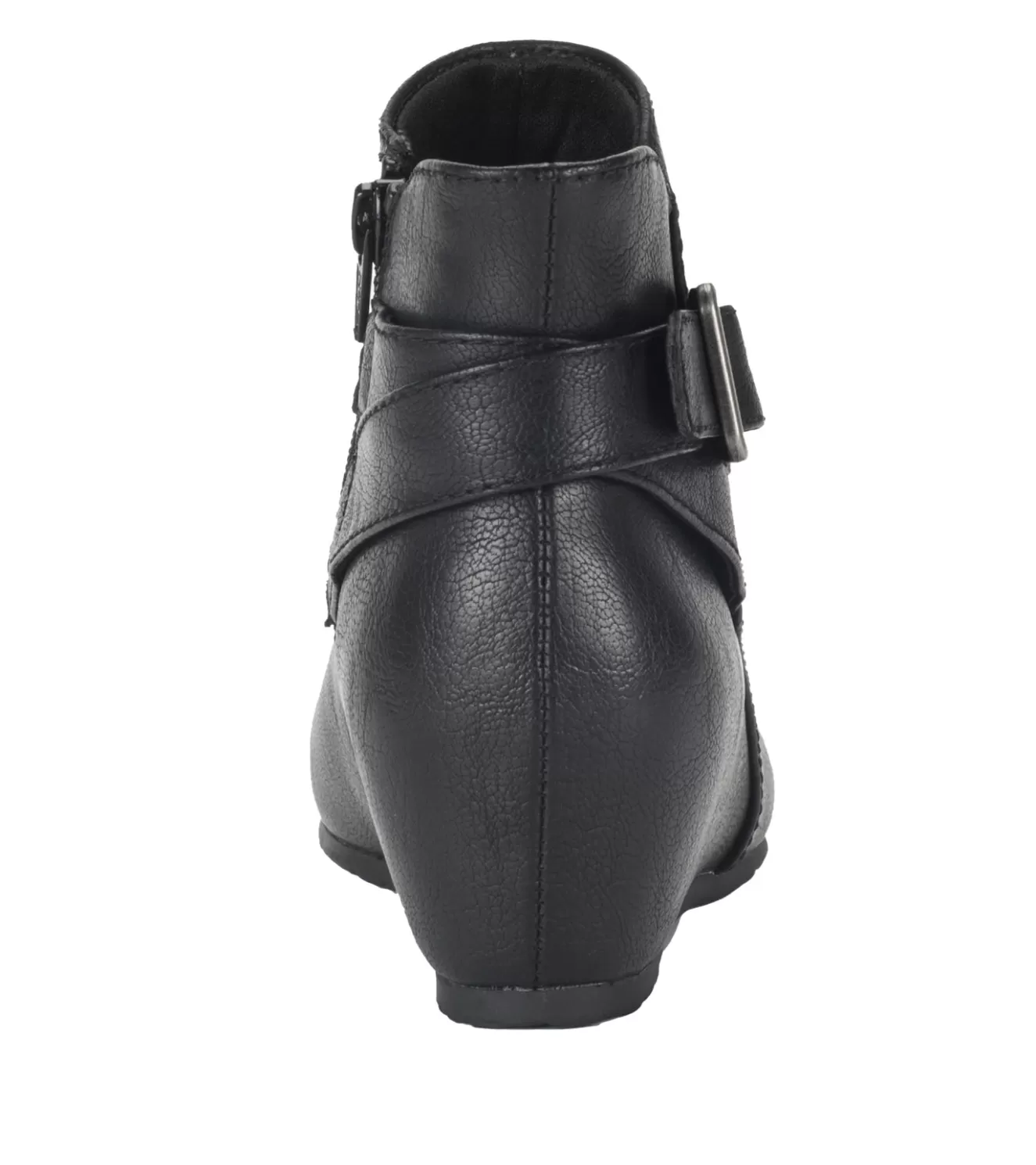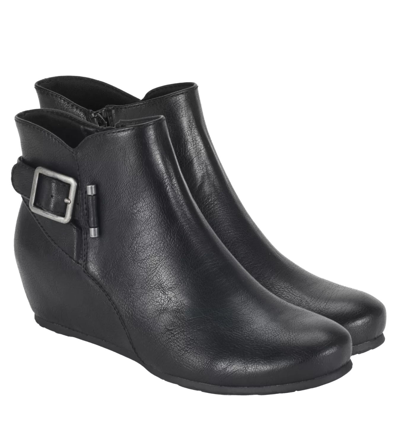The striking silhouette that only a wedge can provide is on display with the Baretraps Serena ankle boot. The sole isn’t just fashionable; it also provides structure and balance to this uniquely walkable boot. Inspired by classic round toe styles, they also have modern touches like the practical side-zipper closure and artistic craftsmanship noticeable in the half-wrap buckle. Matched with it’s flexible, slip-resistant outsole makes these great to wear outdoors in the fall with soft, warm attire like a knitted maxi dress and patterned tweeds or flannels.