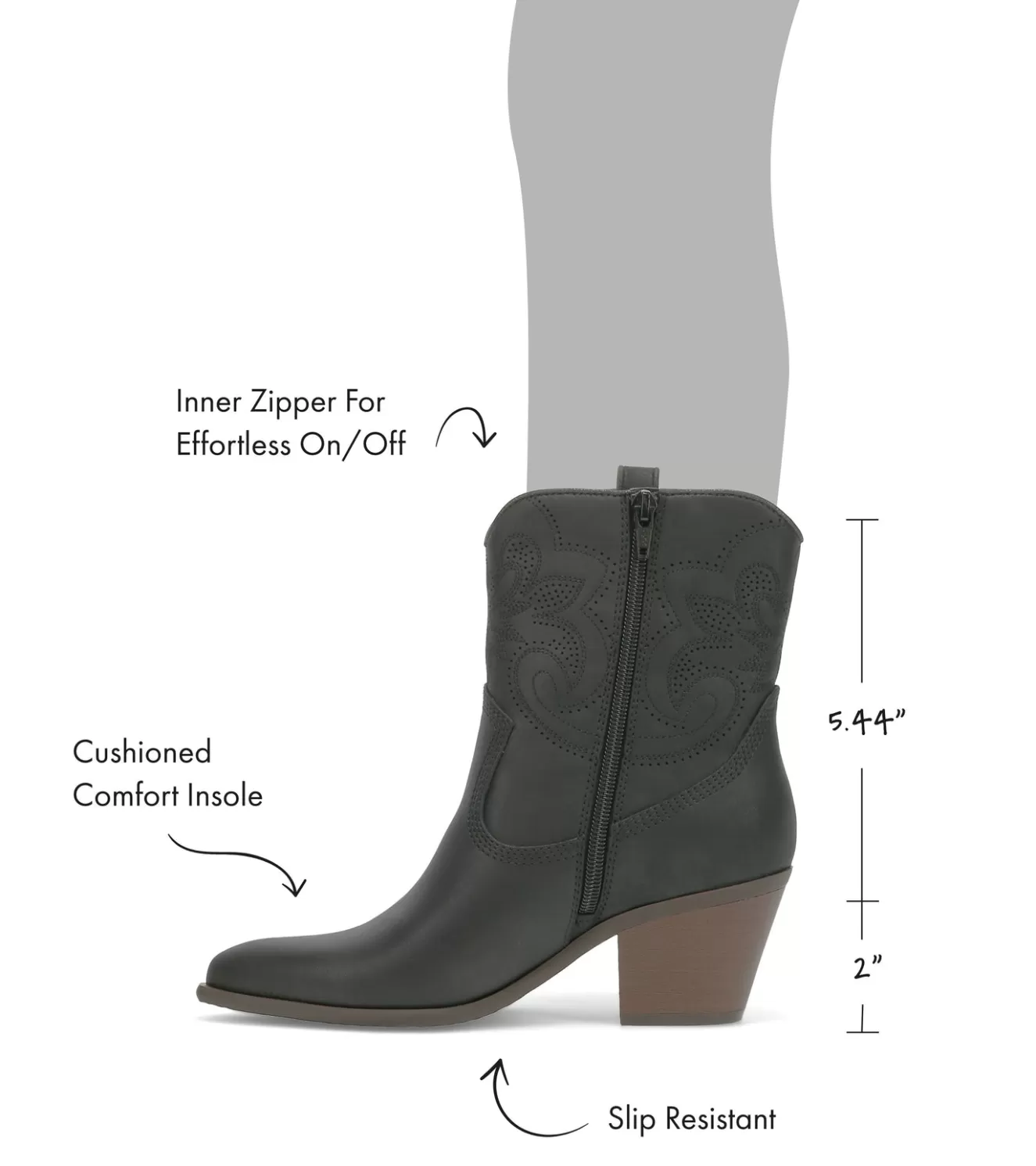 Uncover the rugged elegance of Baretraps Yenni Western Boots. Crafted with a sleek synthetic upper, these boots seamlessly blend modern style and timeless appeal. The inside zipper closure ensures easy on and off, while the cushioned comfort insole and lightweight, flexible outsole provide all-day wearability. The microfiber footbed adds a plush, supportive foundation, keeping your feet comfortable through every stride. With an ankle-high silhouette, patterned upper and a classic pointed toe, the Yenni boots exude a refined Western aesthetic that effortlessly transitions from the ranch to the city. Finished with a sturdy block heel, these versatile boots will elevate your look and keep you confidently on the move. Experience the perfect balance of fashion and function with Baretraps Yenni Western Boots – a must-have addition to your wardrobe.